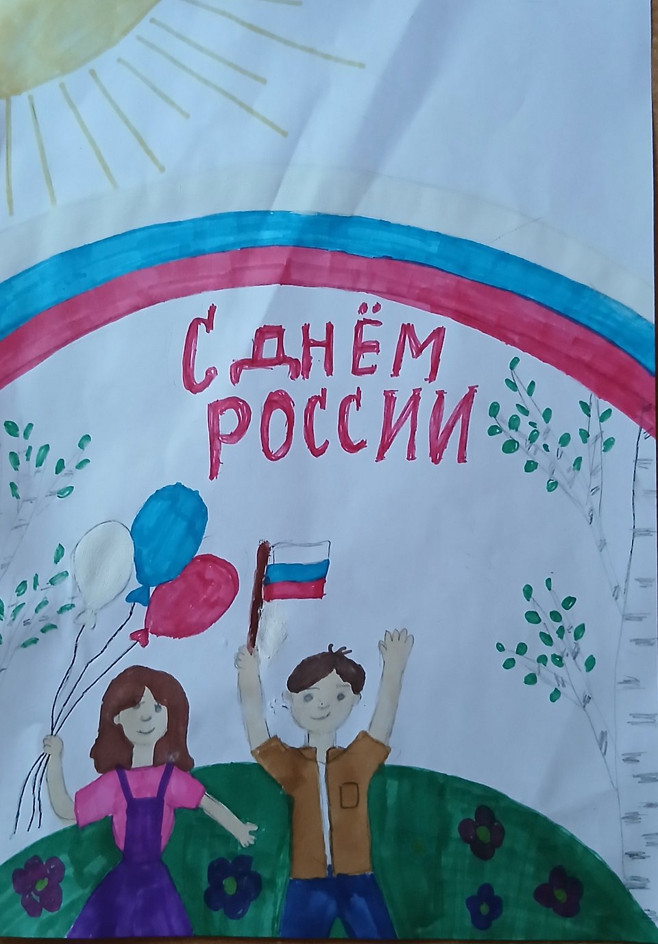 Описание: Работа выполнена на листе бумаги формата А4. В рисунке изображены солнце, облако, флаг, цветочки, береза, дети. Линии, выполненные карандашом, тонкие и используются