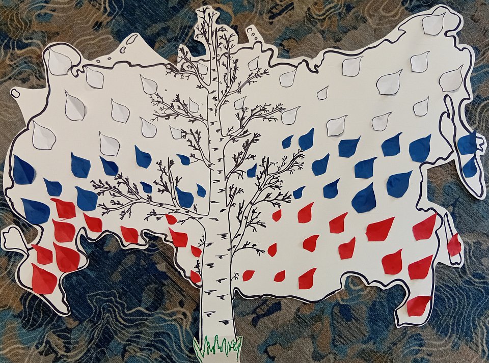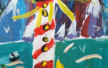Возраст участника 4.9 года, работа нарисована чёрным маркером (ребёнок обводил рисунок, выполненный карандашом) и дополнена цветной бумагой и клеем.