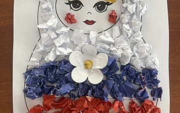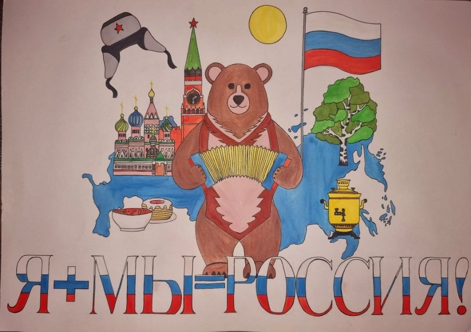 Рисунок День России 12 июня с символами нашей Родины: медведь с гармошкой, флаг, русский самовар и московский кремль.