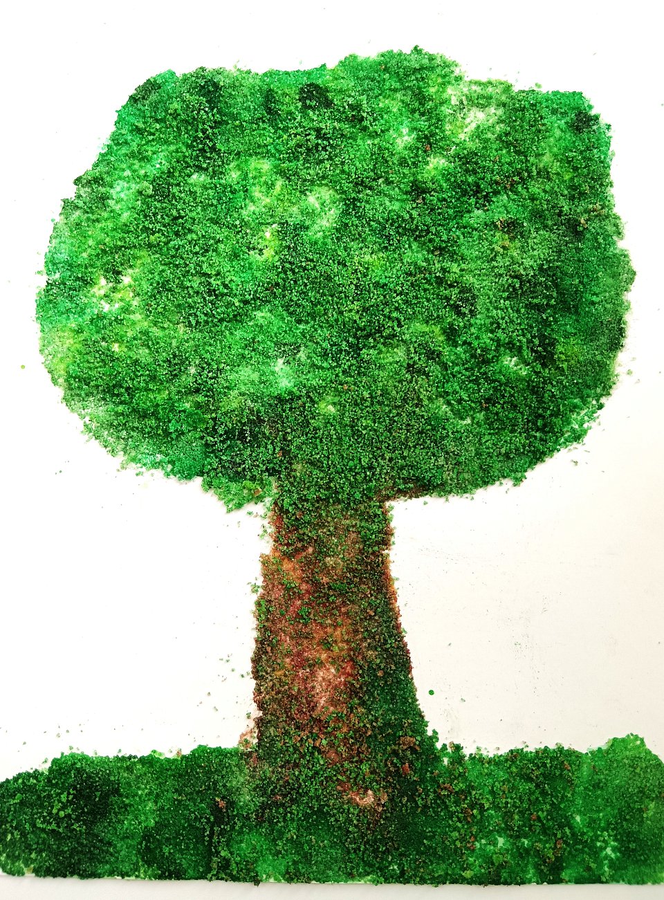 дети 3 -х лет, техника - рисование солью; материалы: акварель, клей ПВА, соль