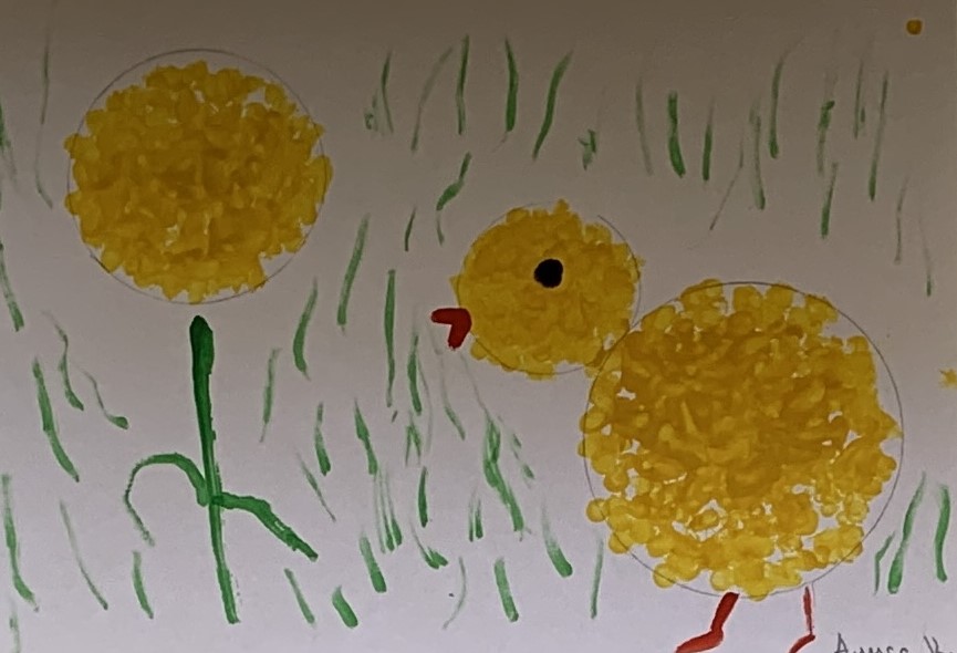 4 года. Работа выполнена тычком ватной палочкой, гуашь.
