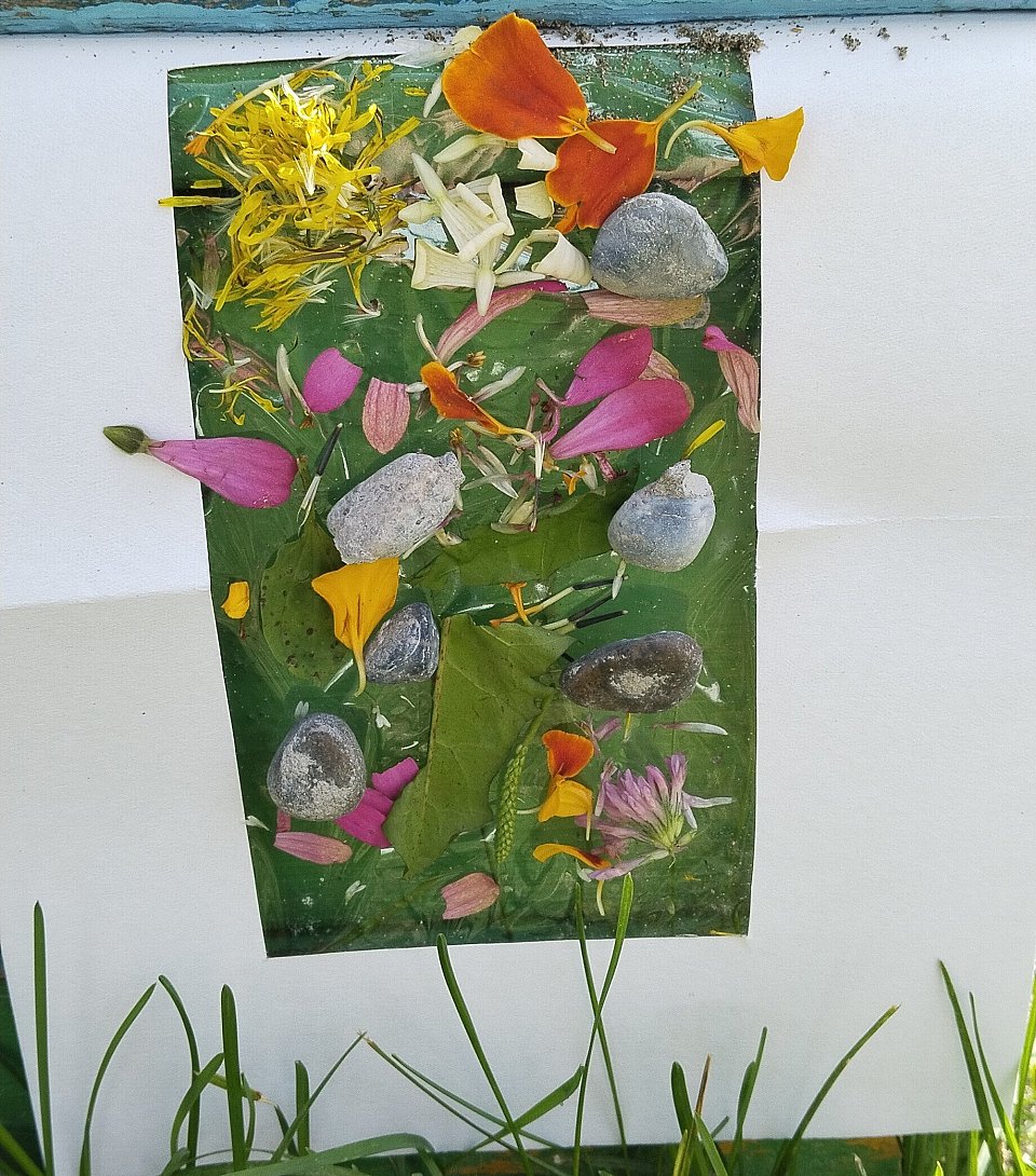 Участнику 5 лет. Ребёнок находил на улице любые материалы и клеил их на скотч. Получилась летняя картина.
