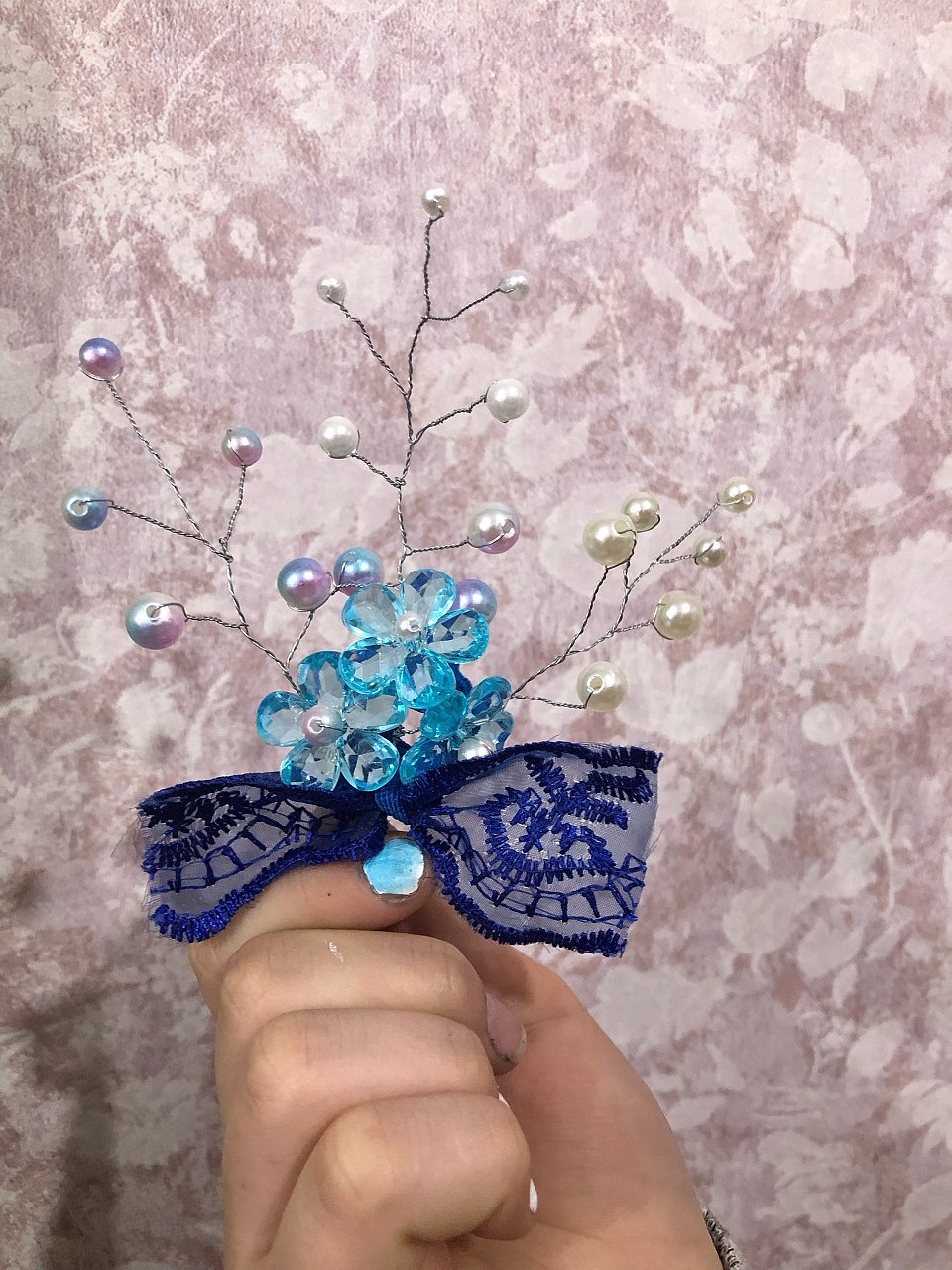 Маше 13 лет, работа выполнена из бусин, элементов декора, кружева и проволоки, используется как бутоньерка.
