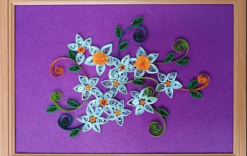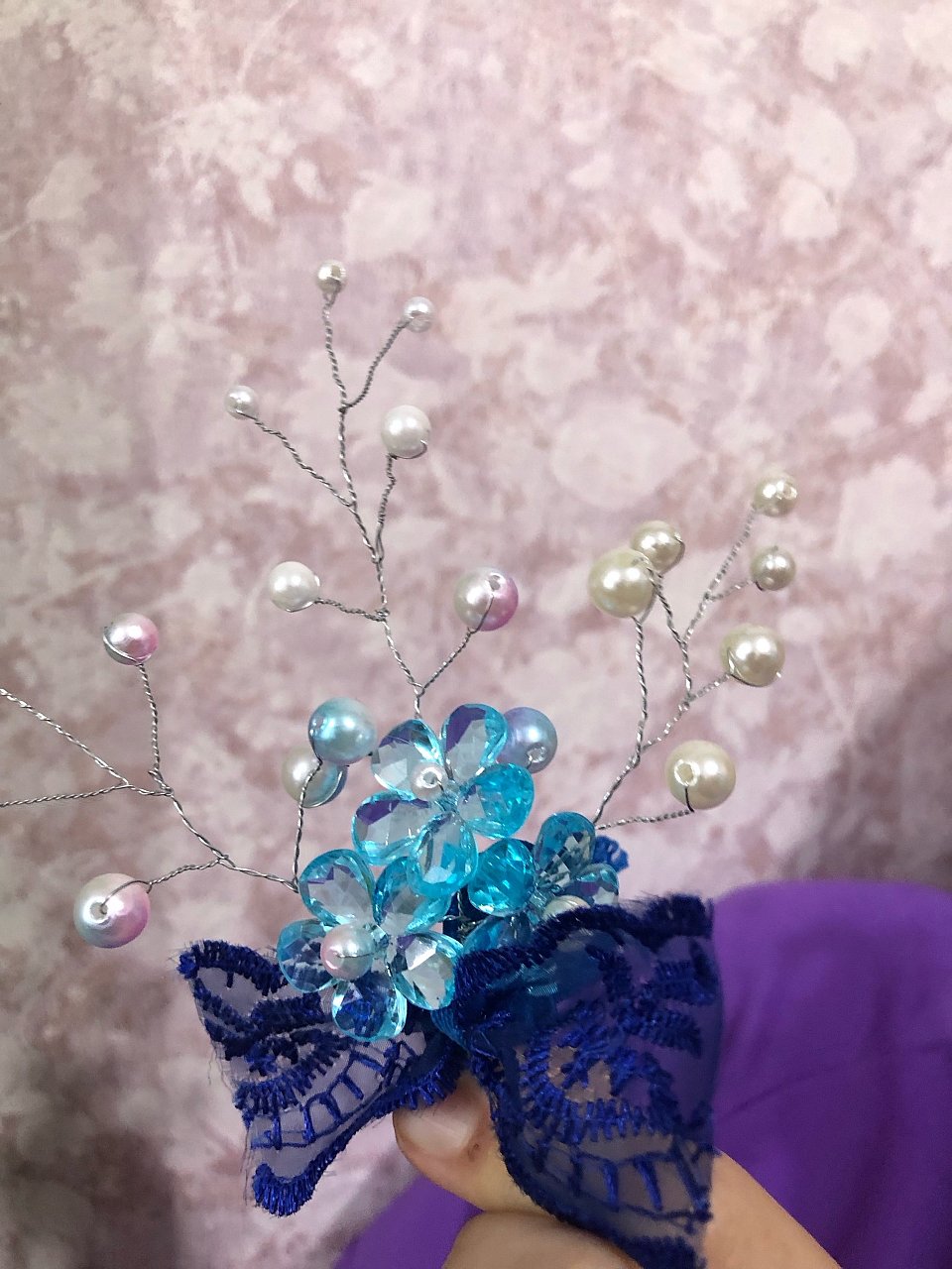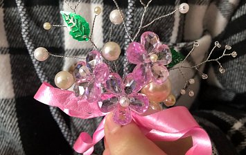 Насте 13л. Данная работа выполнена из бусин и проволоки, путем скручивания. Бутоньерка украшена кружевом, все элементы подобраны в одной цветовой гамме.