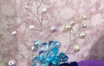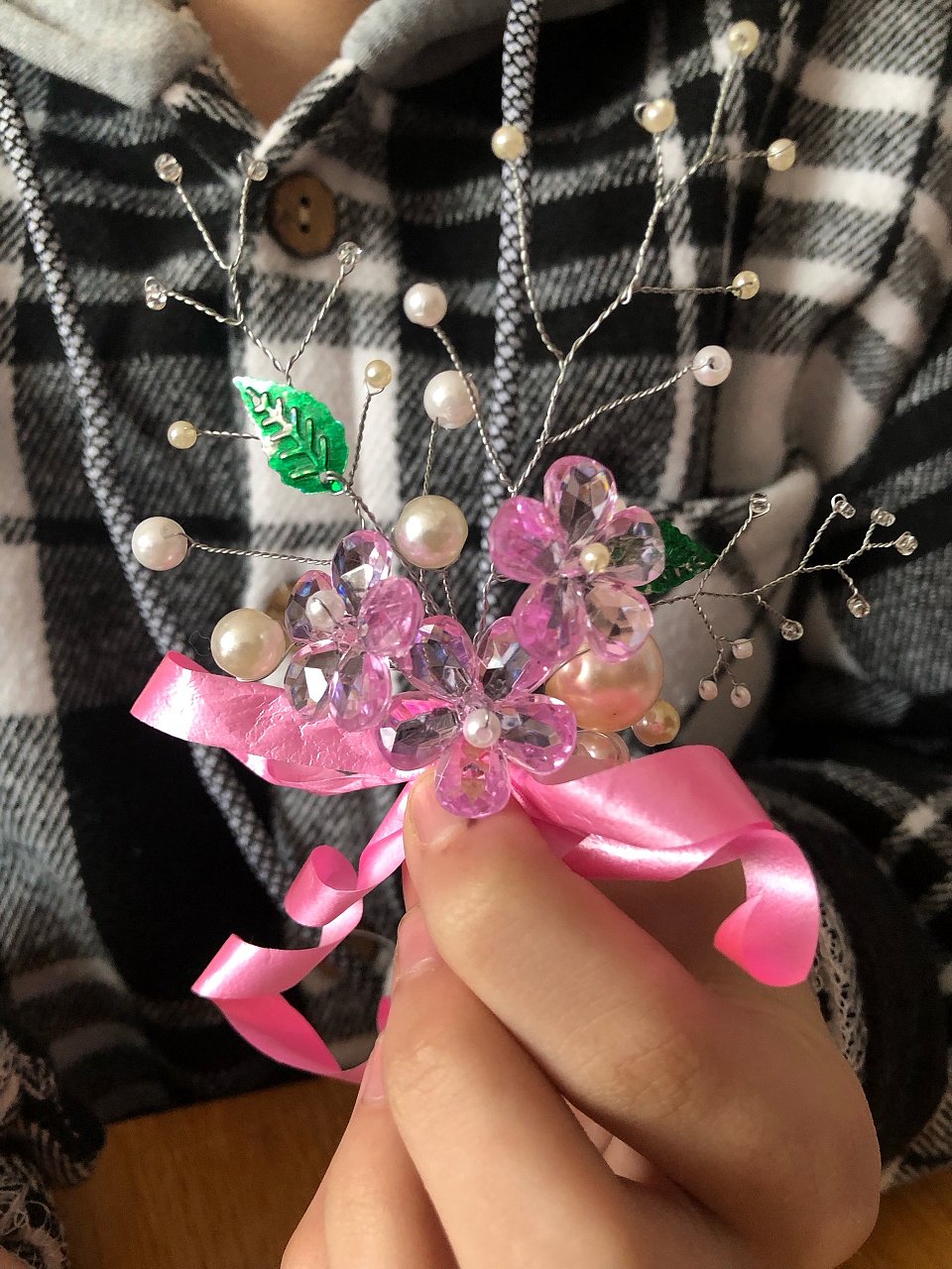 Полине 13л. Бутоньерка выполнена из бусин, проволоки и элементов декора.