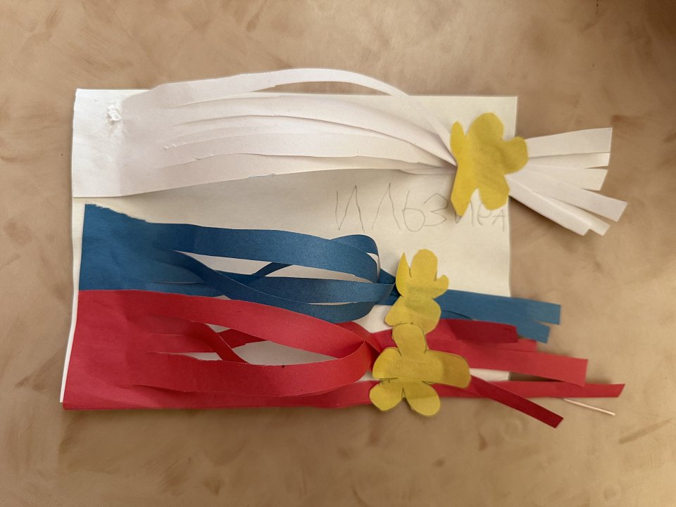 Объемная Аппликация , ребенок 6 лет. Использованные материалы: цветная бумага, картон, ножницы, клей
