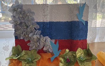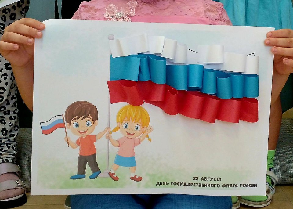 объемная аппликация(цветная бумага, ножницы, клей)из полосок бумаги красной, синей, белой делаем колечки, потом наклеиваем их друг на друга..