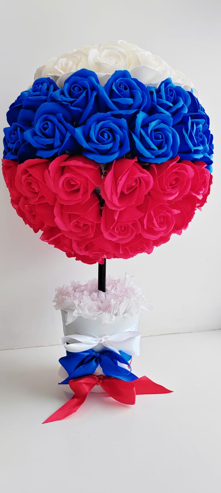 Работа выполнена в цветах флага России с использованием фоамирана, гофрированной бумаги,лент,картона, пенопласта и клея. Выполнила Сухоручкина Милана,7 лет