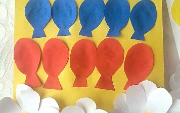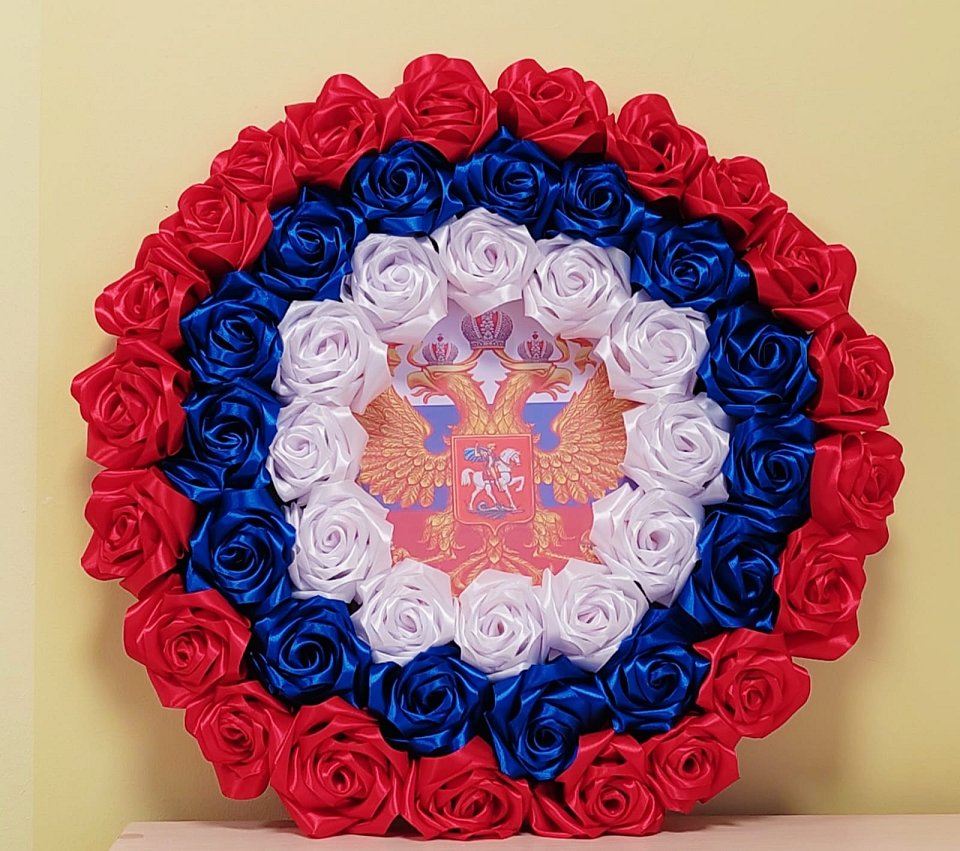 Работа выполнена из лент в цветовой гамме, соответствующей цветам флага РФ. Участнику 5 лет.