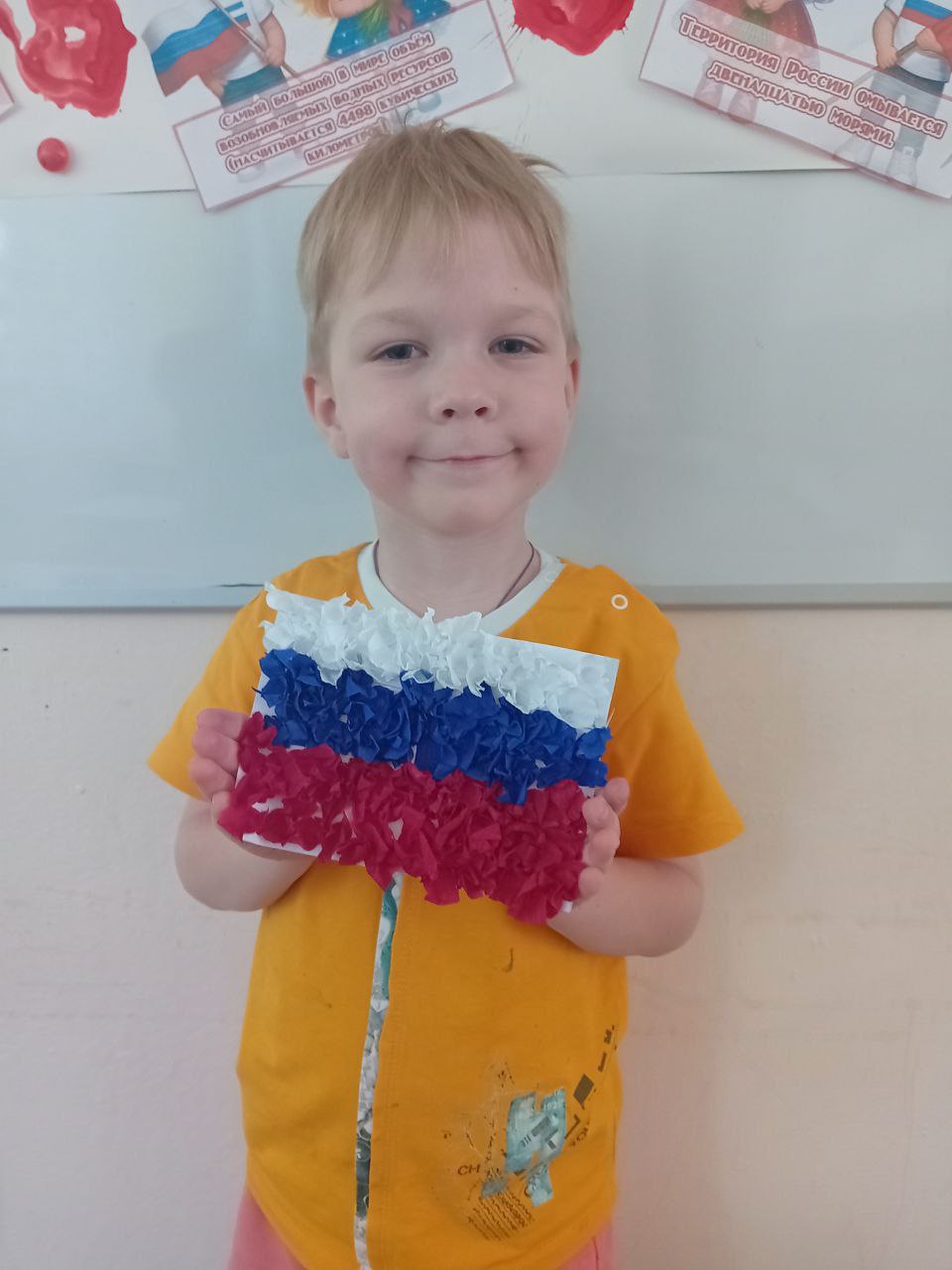 Флаг России. Возраст ребенка 5 лет. Использованные материалы: креповая бумага, салфетки, клей, ножницы