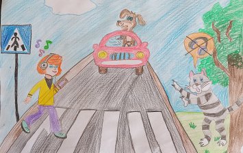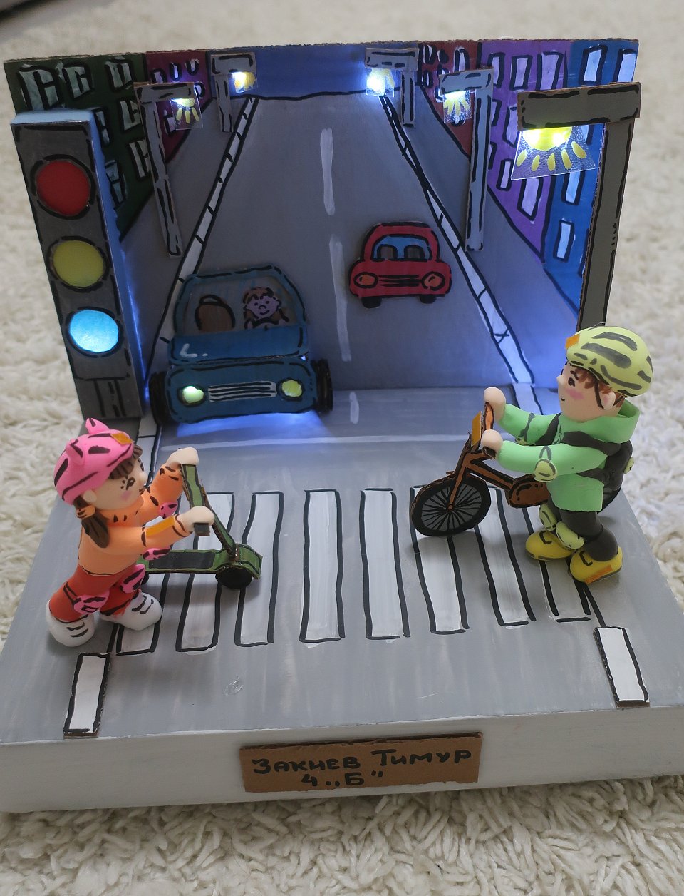 9 лет. Работа выполнена из картона, легкого пластилина, проводов и микросхем. Город. Вечер. Загораются огни. На переднем плане мы видим двух детей ярко одетых. На рюкзаках и одежде светоотражатели. Ребята собираются переходить дорогу, спешившись со своих СИМ.