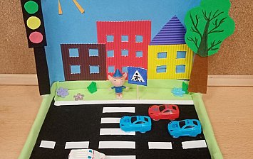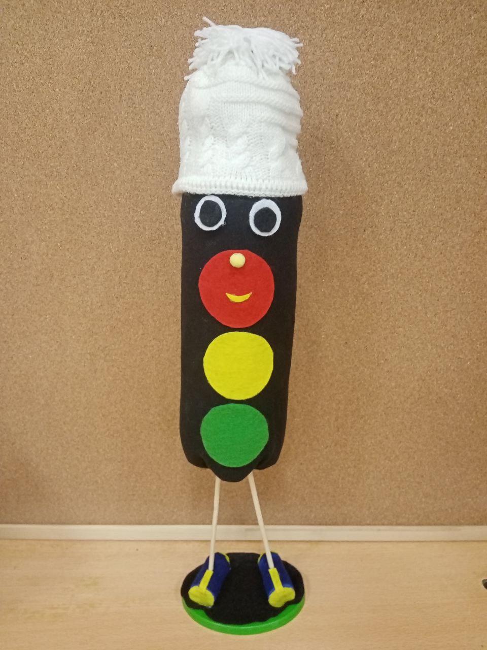 Поделка представляет собой очеловеченную фигуру светофора, выполненную в виде мягкой игрушки. Поделка выполнена в текстильной технике (мягкая игрушка) с элементами аппликации и декорирования.