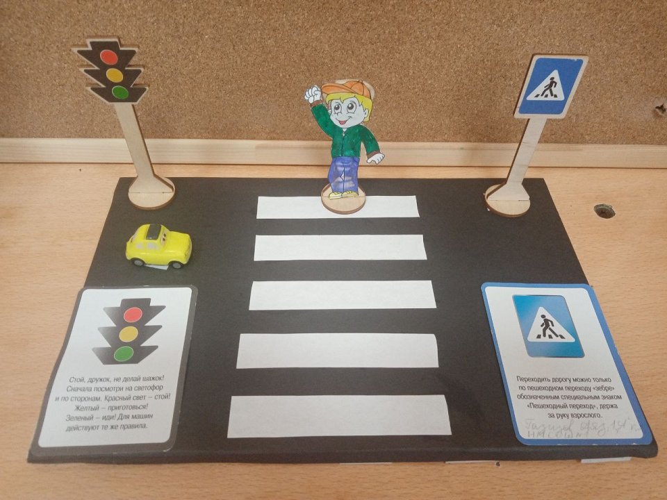 Миниатюрный макет «Безопасный переход»: фрагмент улицы с пешеходным переходом, светофором, дорожными знаками, машинками и фигуркой пешехода.