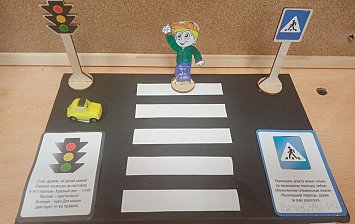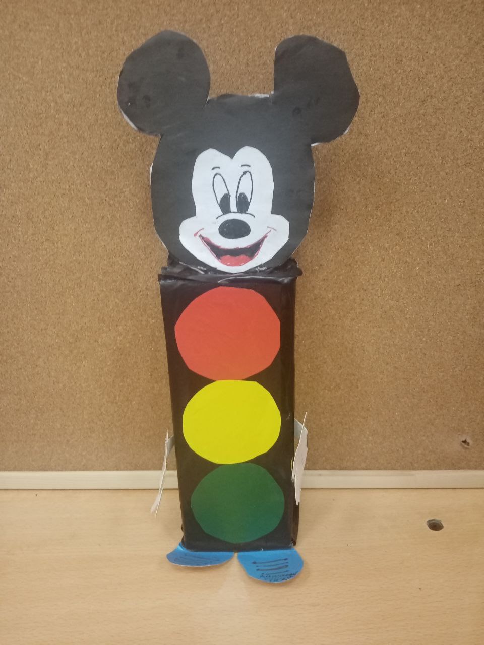 Весёлая поделка — светофор в образе Микки Мауса: корпус из коробки с тремя кругами (красный, жёлтый, зелёный) и головой Микки сверху.