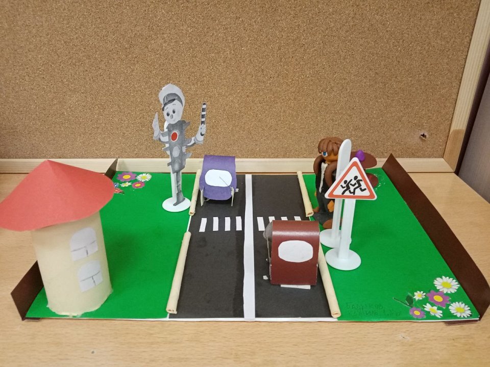 Макет дорожной ситуации, демонстрирующий безопасный переход через дорогу вблизи школы.