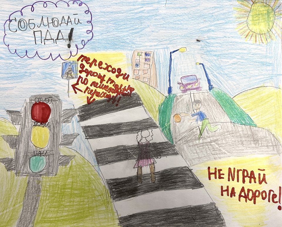Ученица 6 класса, участница отряда ЮИД Рисунок выполнен цветными карандашами , фломастерами и ручкой.
