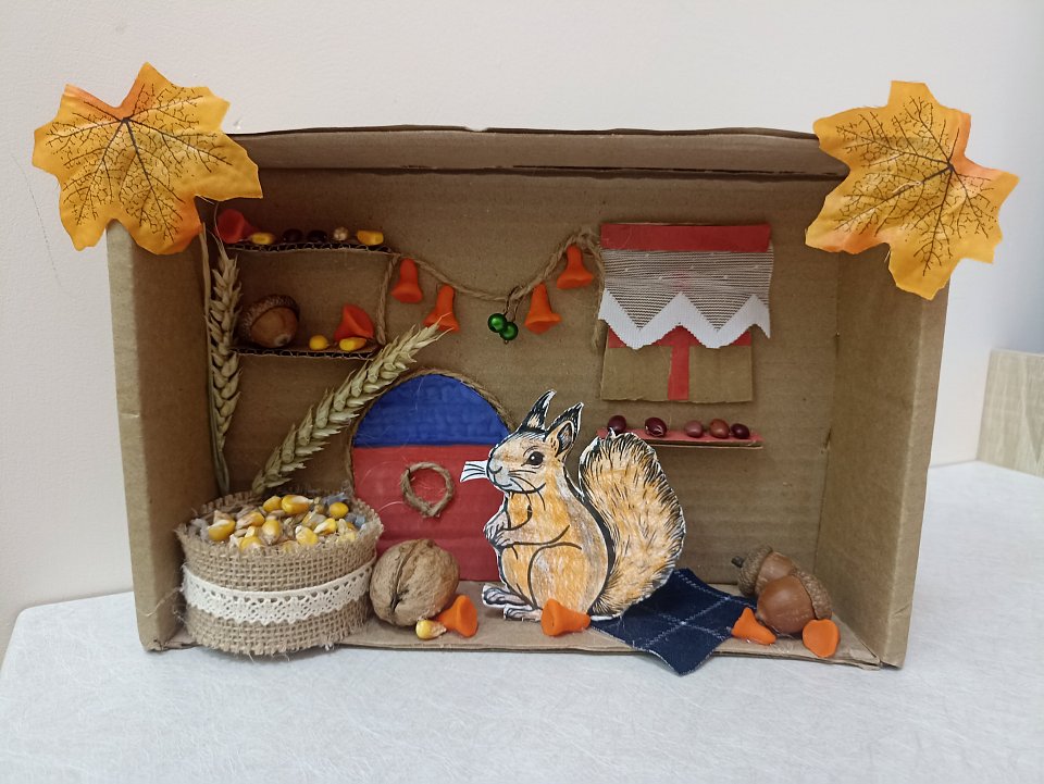5-лет Поделка из природных материалов. (Картон, жёлуди, орехи, колоски, зерно, фасоль, кукуруза, пластилин, ткань, клей)
