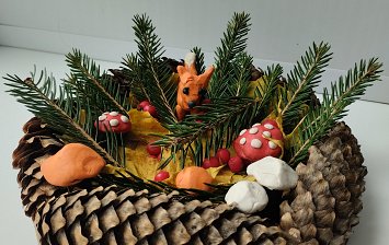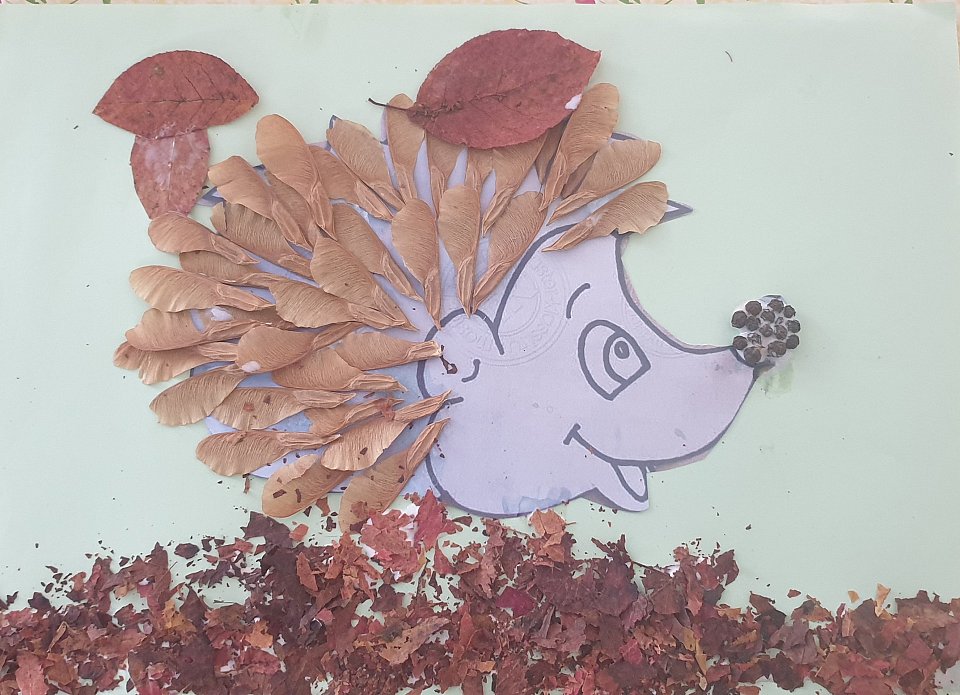 Георгий 4-х лет использовал в работе крылатки клена и сухие листья. На шаблон ёжика наклеивал клеем пва крылатки , носик ежа обклеил перцем горошком, дорожку для ёжика обсыпал размельченными листьями.