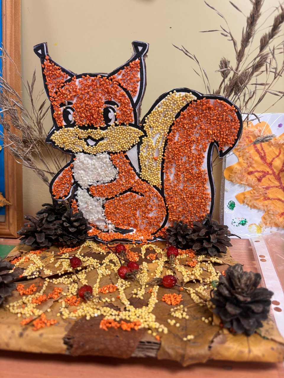 Алене 4 года, работы выполнена совместно с педагогом, из крупы и природного материала.