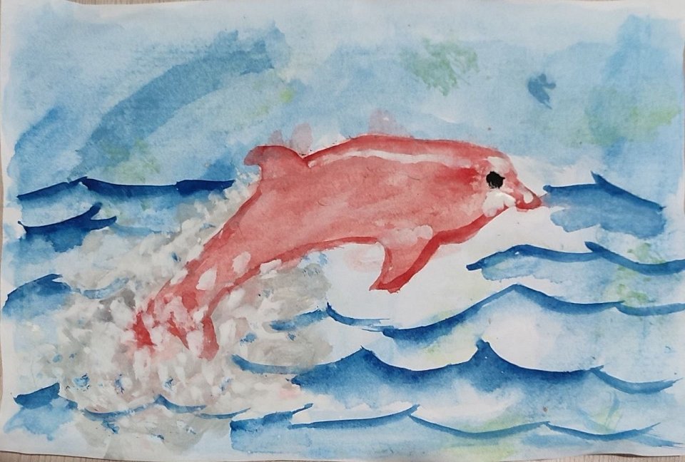 9 лет. Рисунок выполнен акварелью, формат А 4. Пользуясь информацией из красной книги, ребенок решил нарисовать редкий вид дельфина, который находится в зоне риска.