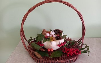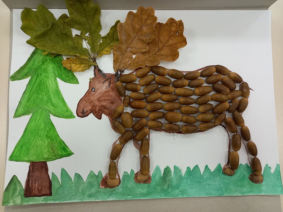 Дубовые листья, жёлули, альбомный лист, клей, краски, карандаш.