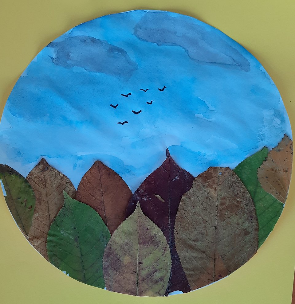 4 года, аппликация и рисование, акварель, листья березы, черемухы, лист альбома, клей