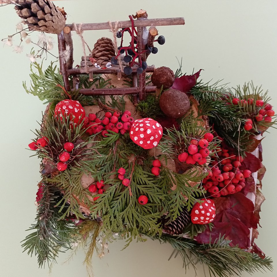 4 года, поделка, веточки, листья, шишки, спил, ягоды, хвоя, солёное тесто, краски, клей.