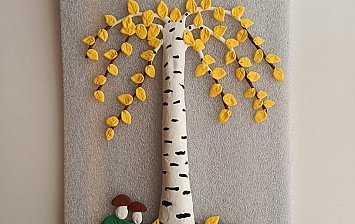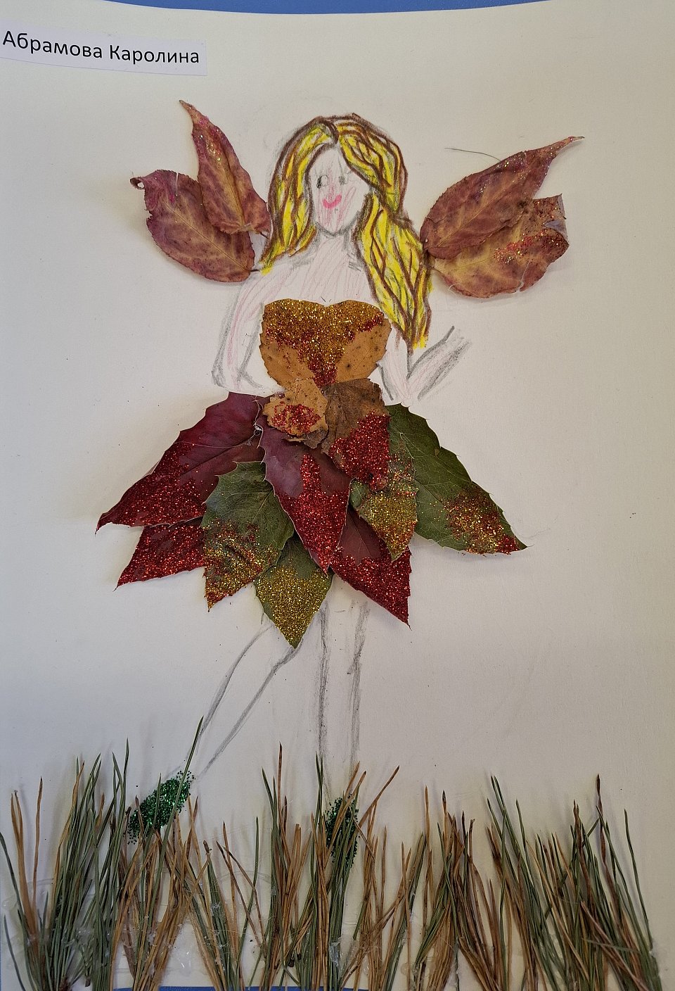 5 лет, работа выполнена в виде аппликации с использованием осенних листьев и карандашей