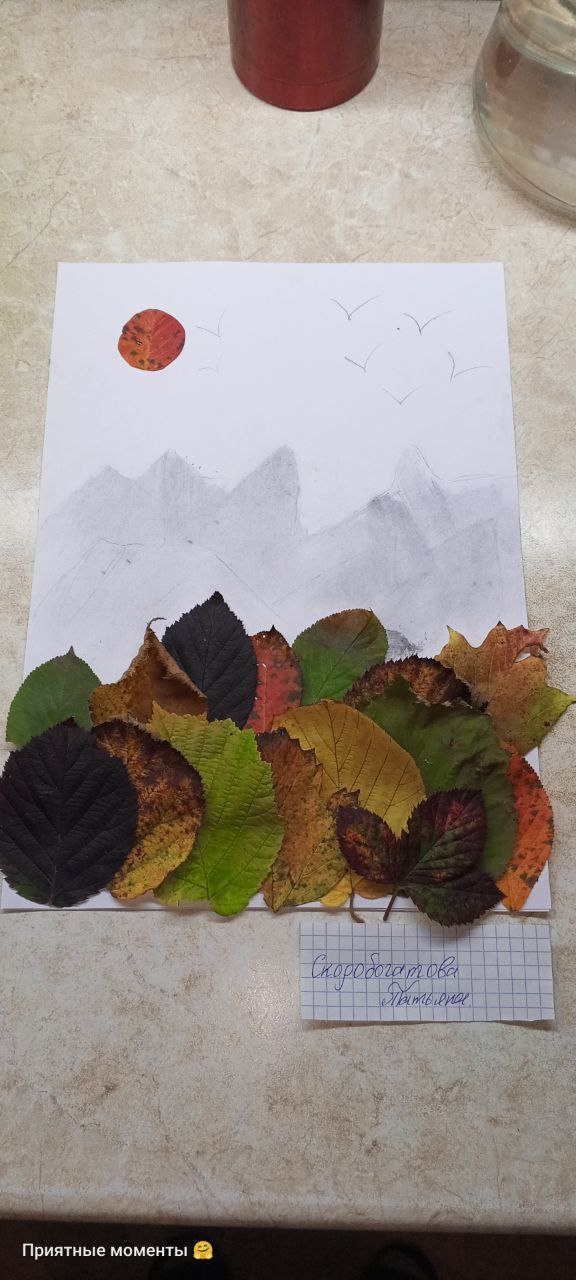 Работа изображает осенние горы, украшенные разноцветными листьями. Листья подобраны по форме и оттенкам, чтобы передать красоту и богатство осенней природы. Тёплые жёлтые, зелёные и красные тона создают ощущение золотой осени и солнечного настроения. Поделка сочетает рисование и аппликацию, развивая у ребёнка фантазию и любовь к природе.
