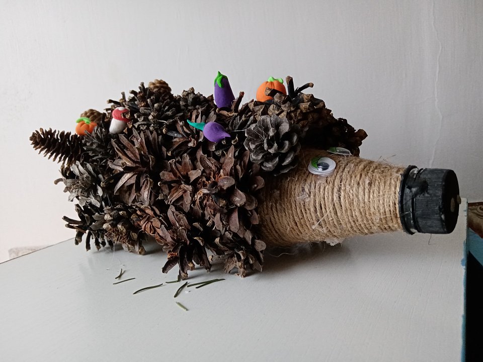 5 лет. Поделка из пластиковой бутылки, шпагата, шишки, пластилин.
