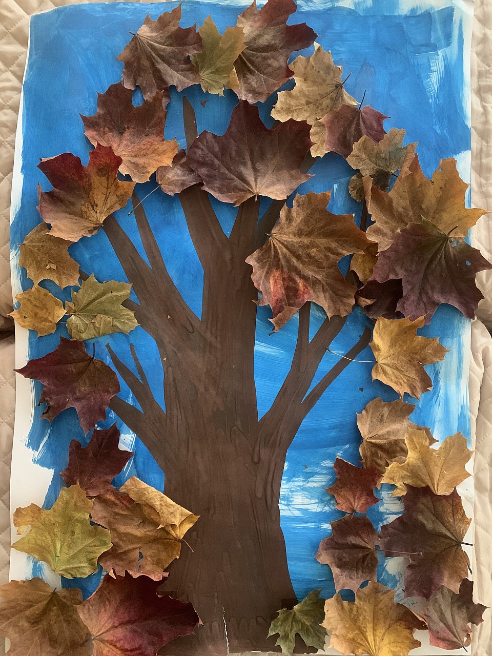 Коллективная работа детей второй младшей группы, возраст 3 года. Работа выполнена в 3 этапа. Первый этап - фон, самостоятельное раскрашивание губкой и гуашью лист ватмана, второй этап - рисование дерева кистью и гуашью воспитателем, третий этап - наклеивание кленовых листьев детьми самостоятельно.