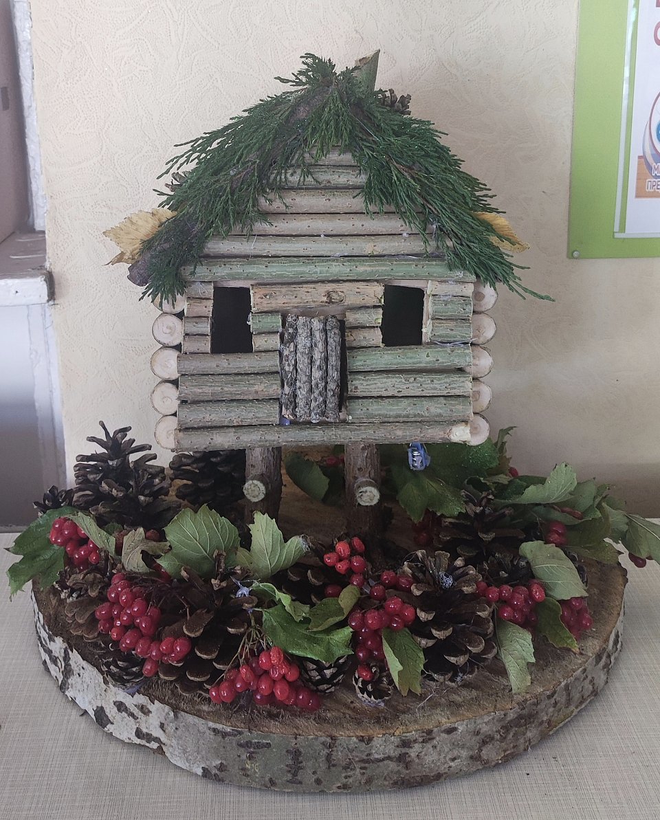 Возраст участника 5 лет. Техника исполнения- работа с деревом. В работе использованы природные материалы: шишки, ветки деревьев, ветки калины.