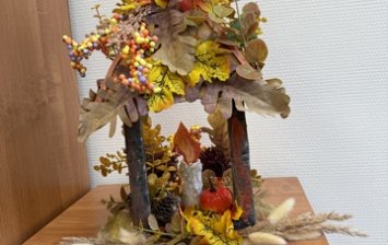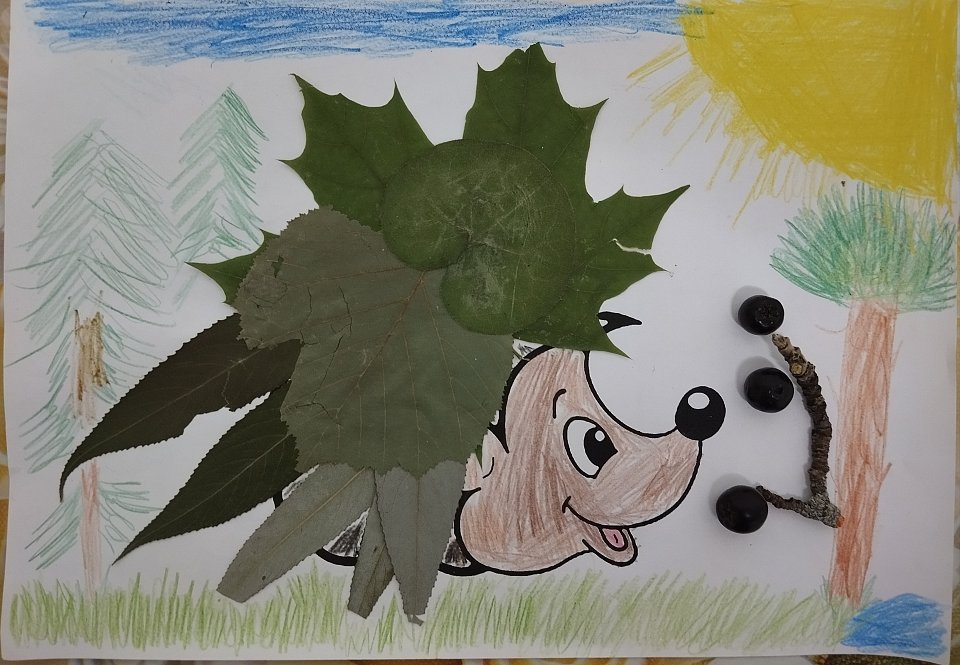Сухие листья, ветка, черная рябина, цветные карандаши, клей