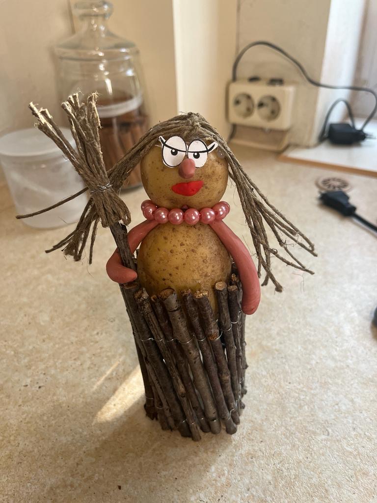 10 лет, поделка из природного материала, выполненная из веток и картошки, символизирующая богатый осенний урожай. Веточки напоминают ветви дерева, а картофель - плоды, подчеркивая изобилие и щедрость осени