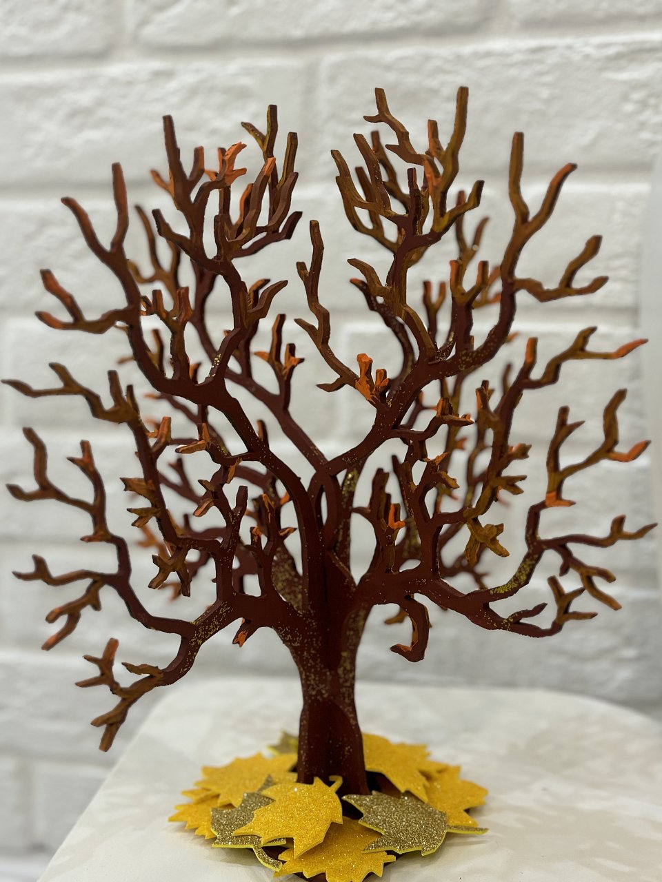 Поделка выполнена с использованием приема - рисование по дереву. Естественную текстуру дереву придает необычная тонировка слоем акриловых красок с помощью сухой кисти. Созданию мерцающего эффекта помог золотой глиттер. Дерево выглядит живым, по-настоящему осенним, сбросившим золотую листву, поблескивающим в лучах солнца.