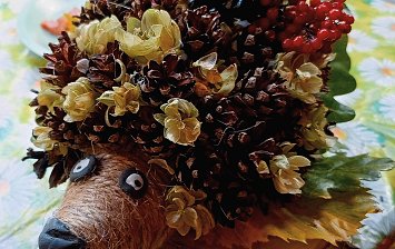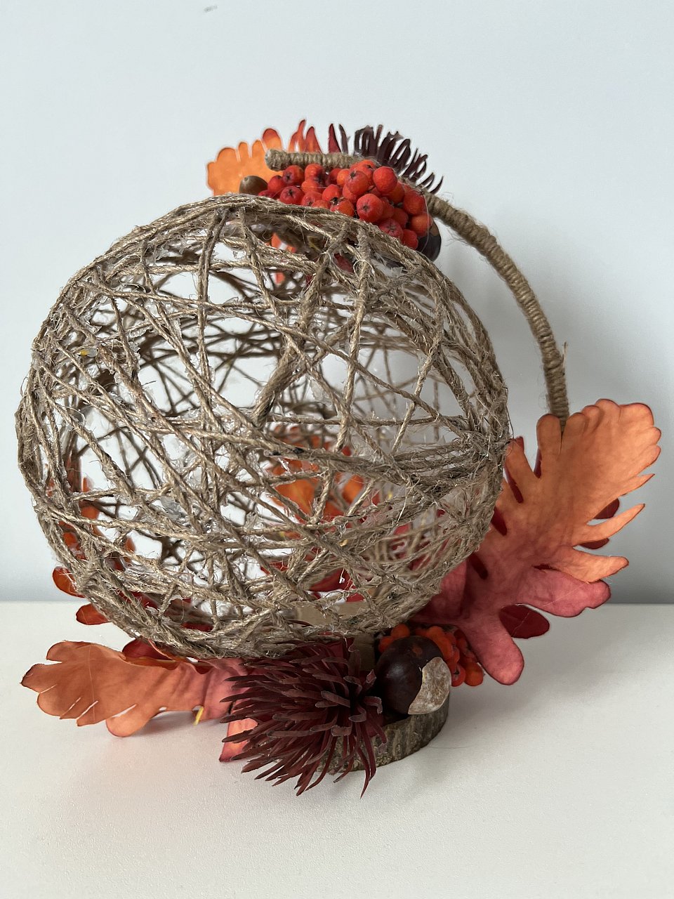 Работа выполнена по принципу папье-маше. Земной шар украшен рябиной, каштанами, желудями и искусственными листьями.