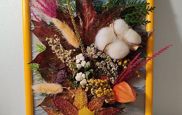 Окрашенные гуашью шишки формировались на клевой основе в корзину, корзину ребёнок декорировал осенними листьями и лентой.