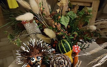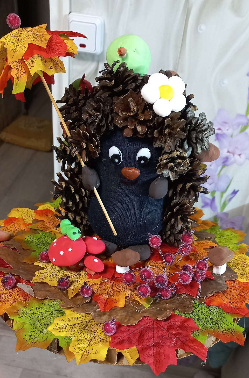 Лиза 8 лет,ученица 2го класса, делала ежиху долго но,сама! Понадобилось:шишки,горячий клей, искусственные и сухие листья,воздушный пластилин,картон для основания!