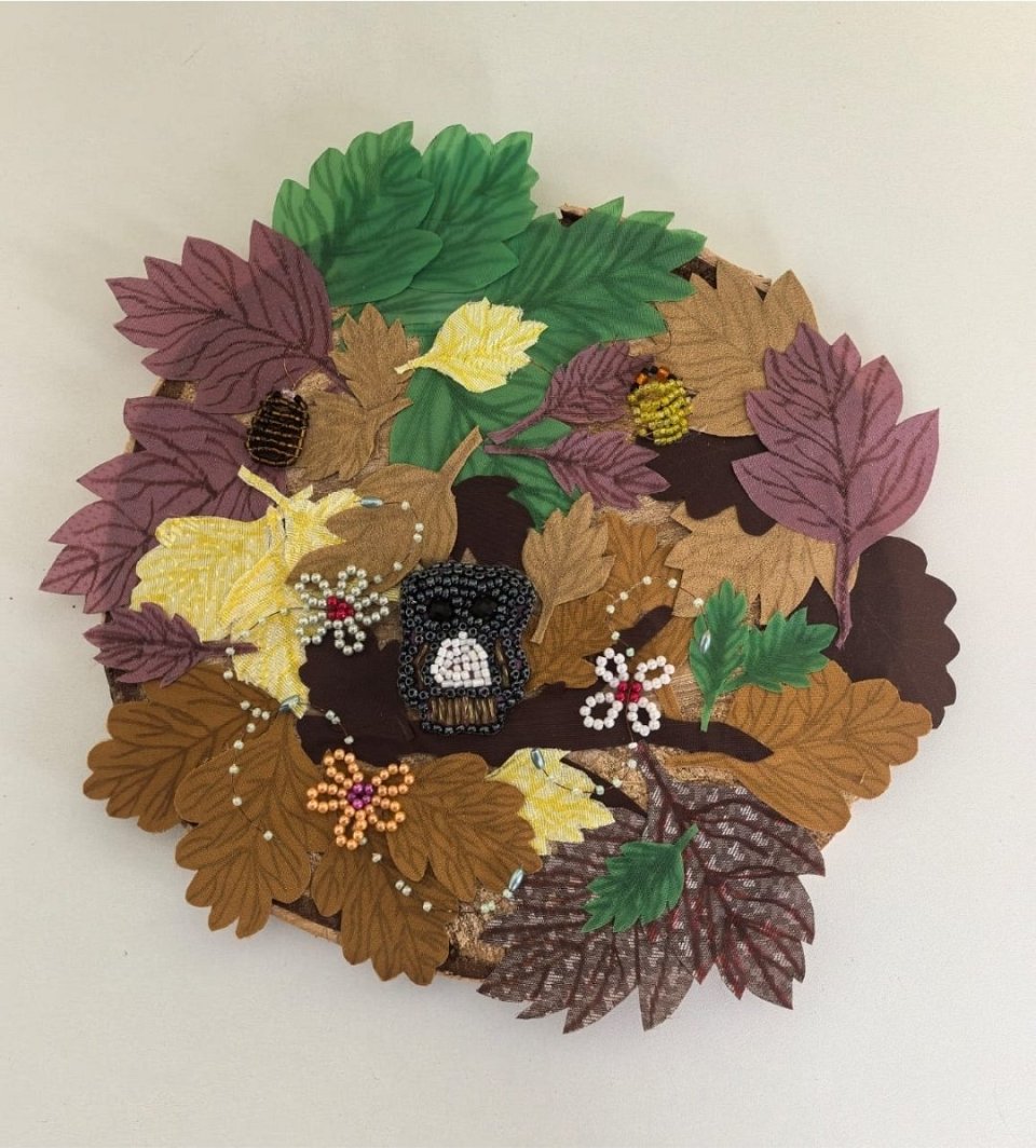 Работа полностью ручная. Использованы материалы: ткань, скотч, клей, природный материал доска из березы,бисер, страза, проволоки