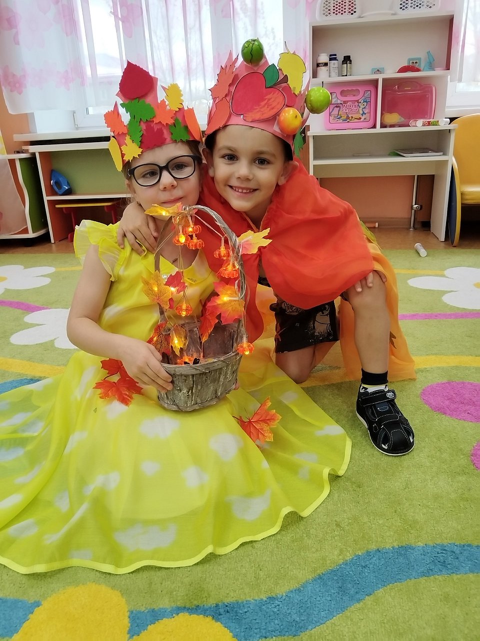 Работа выполнена педагогом. Короны изготовлены из картона, фетра, бархатной цветной бумаги, муляжи фруктов и овощей для организации фотосессии