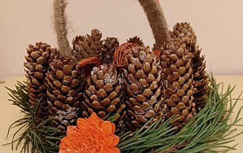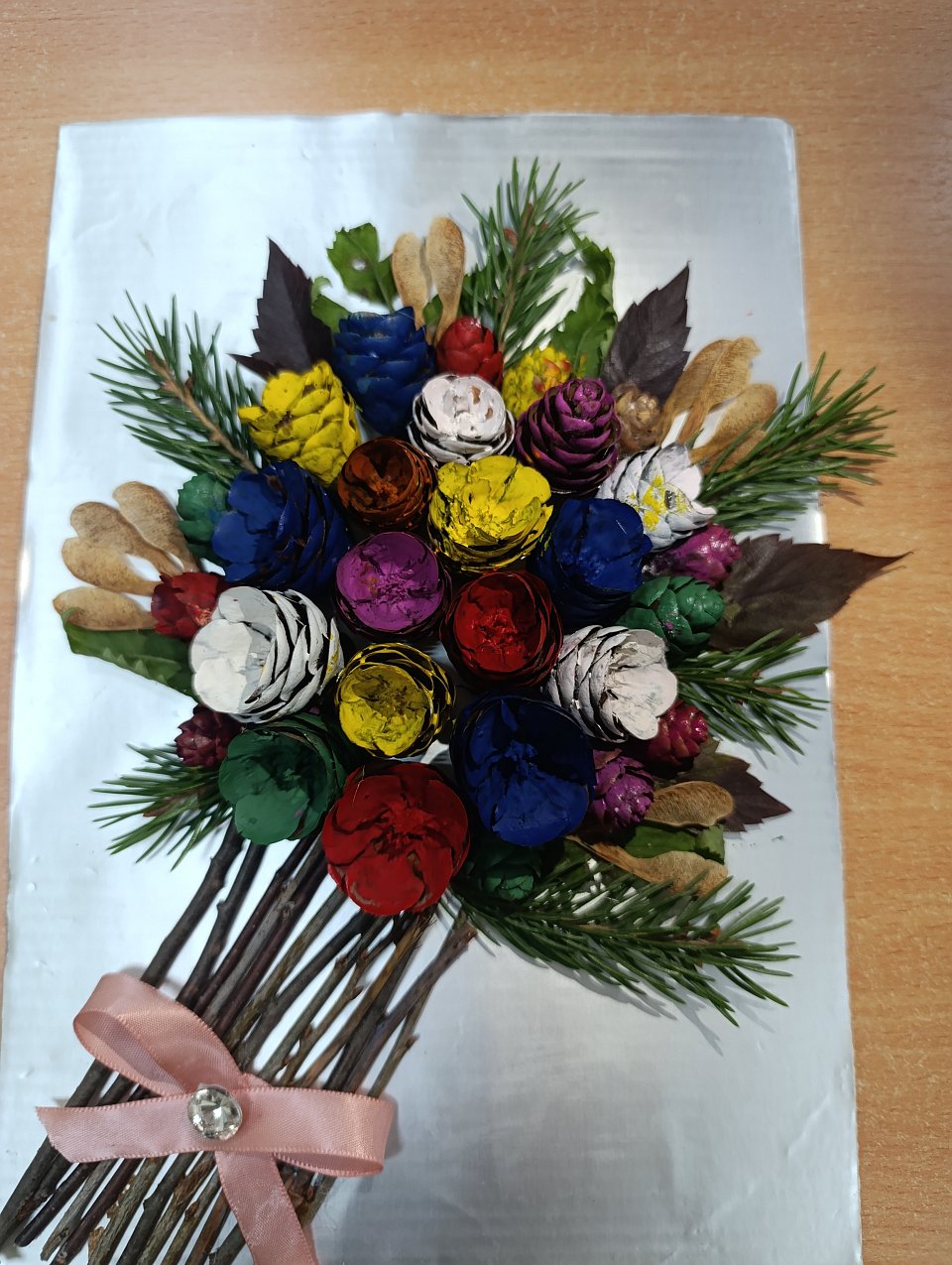 Осенний букет, выполнен из природного материала: шишек, веточек хвойных деревьев и листьев.