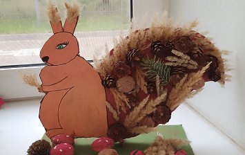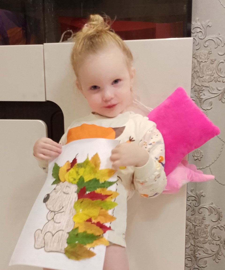 Возраст 2,8. бумага, рисунок, восковой карандаш, клей, природный материал (листья).