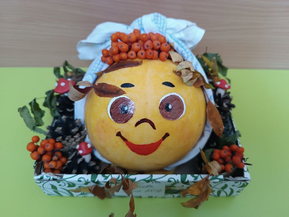 Поделку сделала воспитанница старшей группы, 5 лет. Были использованы природные материалы, ягоды рябины и тыква.