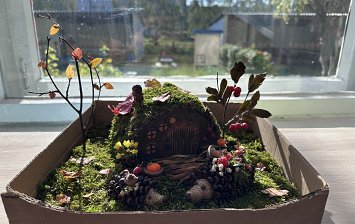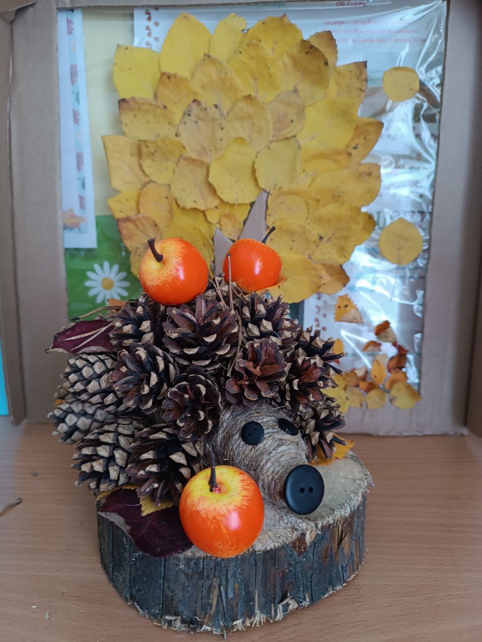 Ляйсан 4 года, поделку сделали вместе с мамой. Были использованы природные материалы такие, как шишка, пенек; также использовались веревка, пуговицы, искусственные яблоки.