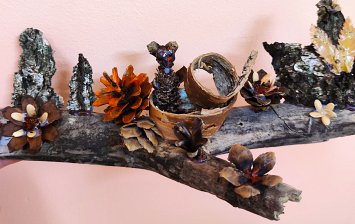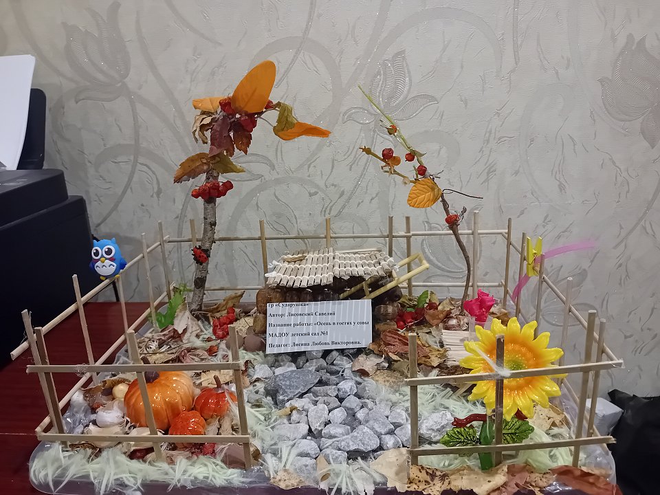 Поделка на тему: "Осень в гостях у Совы." Техника исполнения: осенние листья, веточки рябины, овощи,камешки, деревянная беседка, деревянный заборчик.