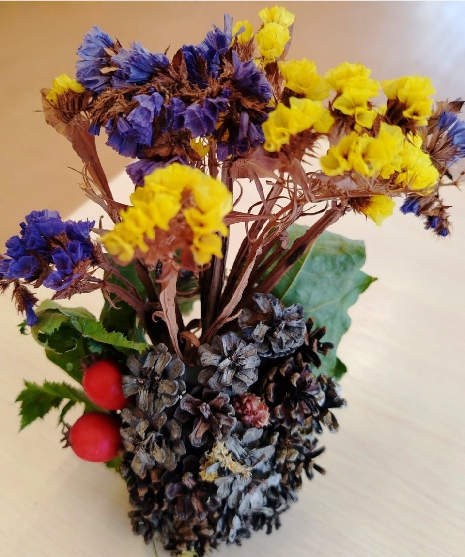 Перед вами осенняя композиция, которая словно переносит нас в волшебный лес. В центре композиции находится шишки, украшенные сухими цветами и ягодами, что придает ей особую изысканность. Вокруг расположены яркие цветы: желтые и синие, которые создают контраст с зелеными листьями и красными ягодами. Эта композиция вызывает чувство уюта и тепла, напоминая о красоте осенней природы.