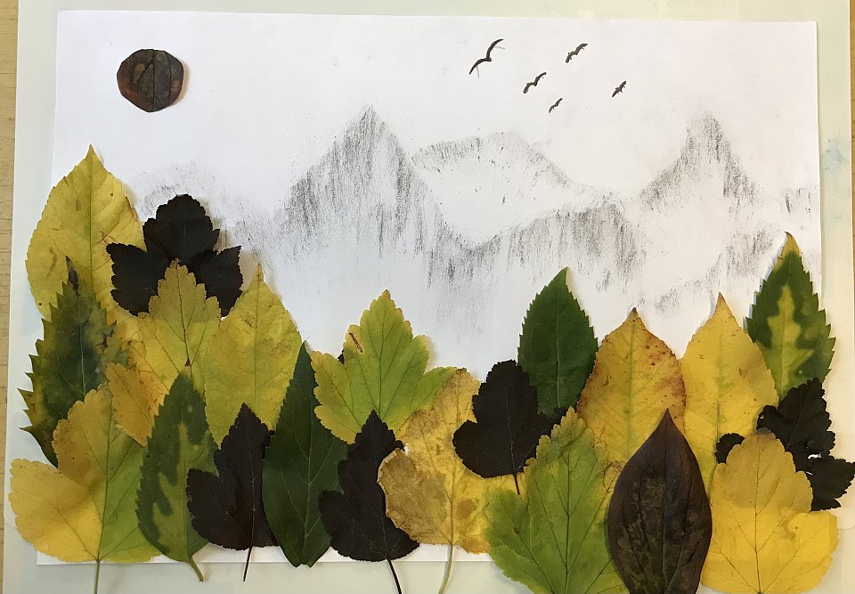 Аппликация из осенних листьев, коллективная работа (Листья, клей, карандаш, трафарет)
