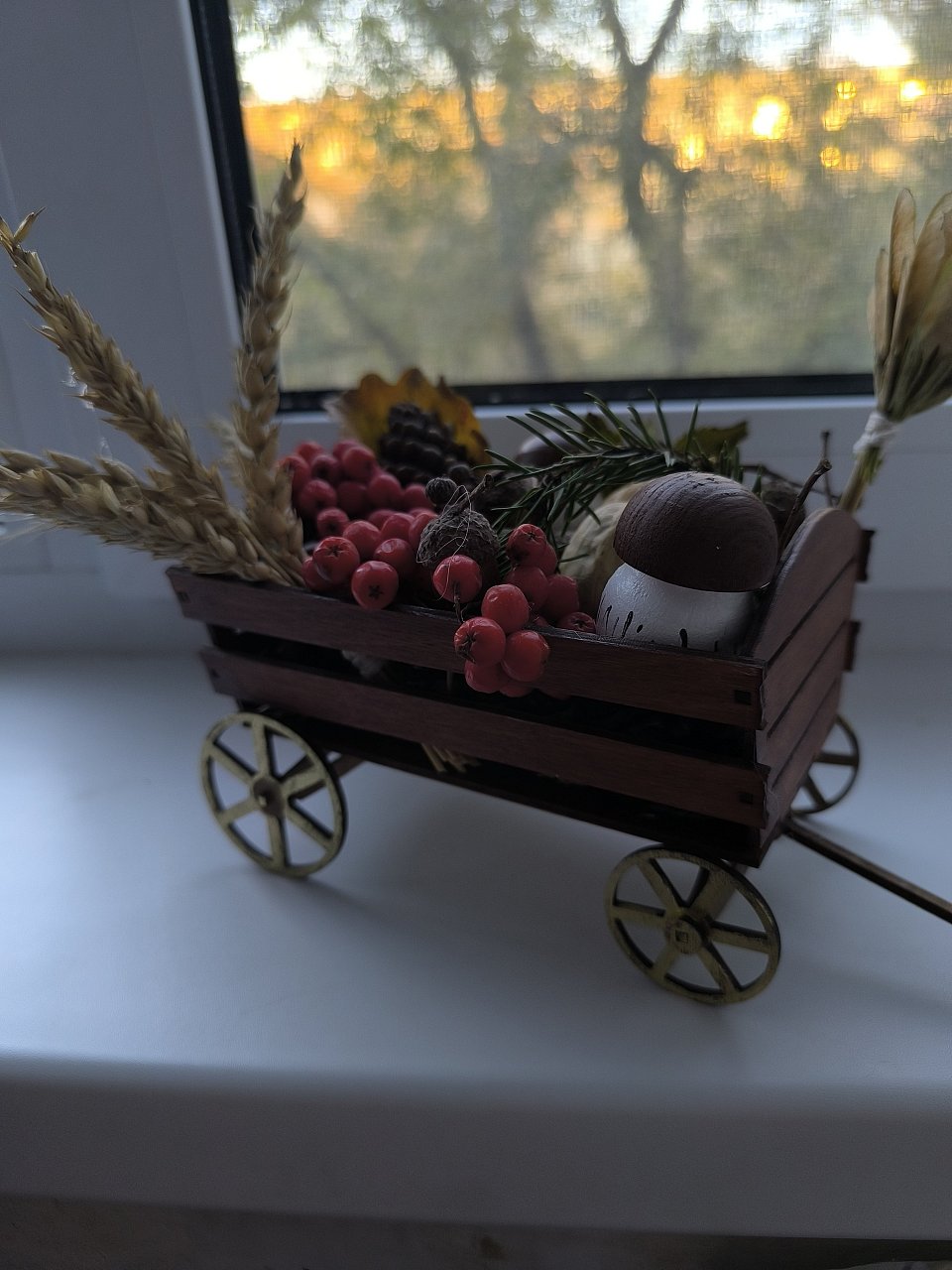 В техники создания композиции из природных материалов. Для данной работы были использованные природные материалы( рябина, шишки,орехи, желудь, колосья пшеницы), телега выполнена из дерева.