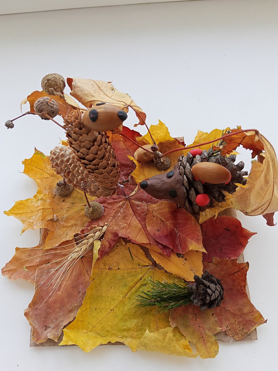 Название работы (декоративно-прикладное искусство) " Осень в мире животных", 3 года. Были использованы природные материалы: осенние листья, шишки, желуди, ветки и т.д.