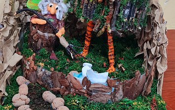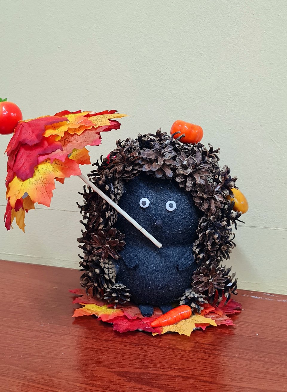 4 года; Поделка из природного материала; Материал: шишки, шары из пенопласта, горячий клей, искусственные овощи и фрукты, листья;